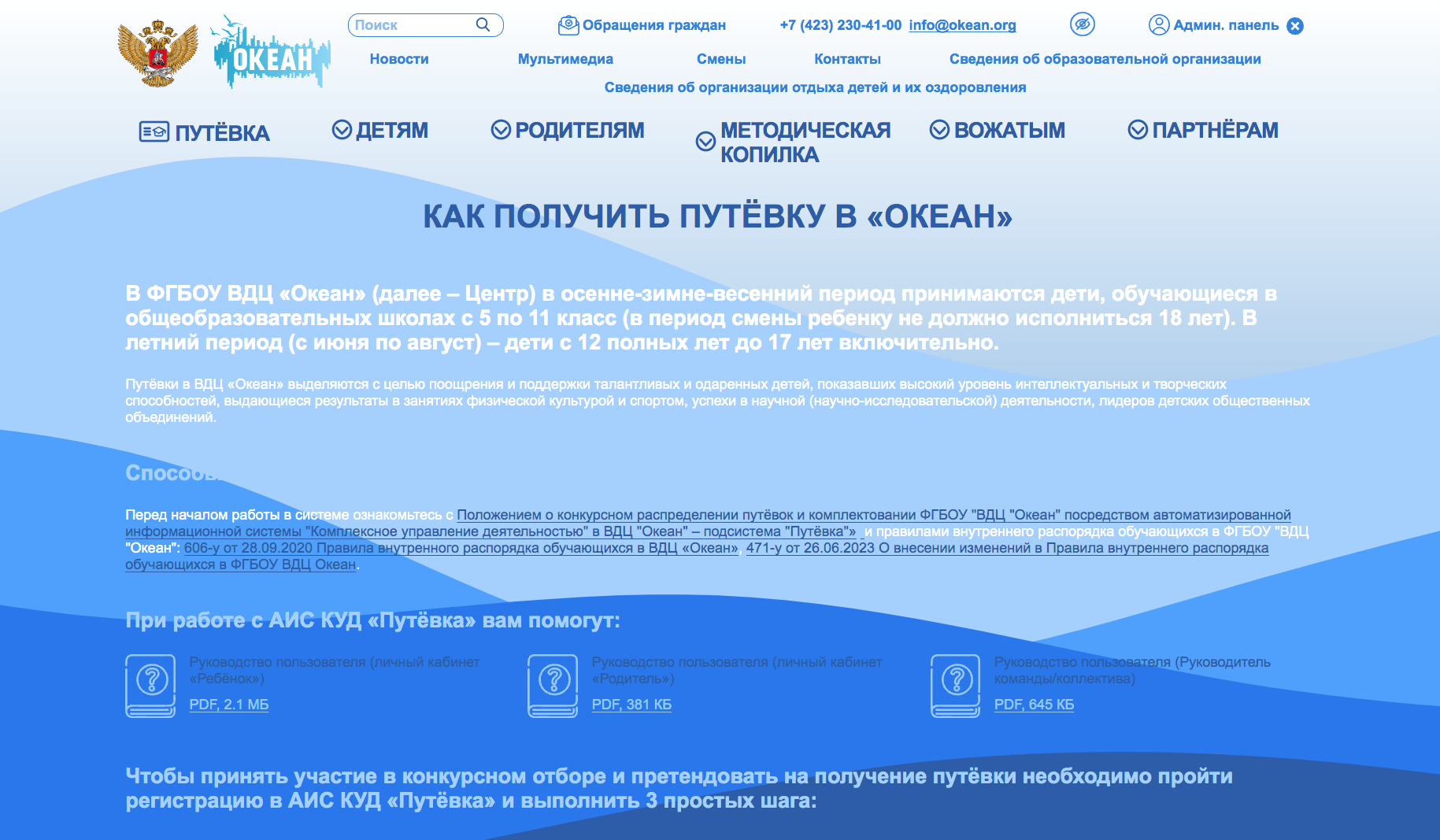 Начинается всё с регистрации в системе по ссылке на официальном сайте «Океана» в разделе «Путёвка». Для успешного прохождения этого этапа важно предварительно ознакомиться с подробной инструкцией.